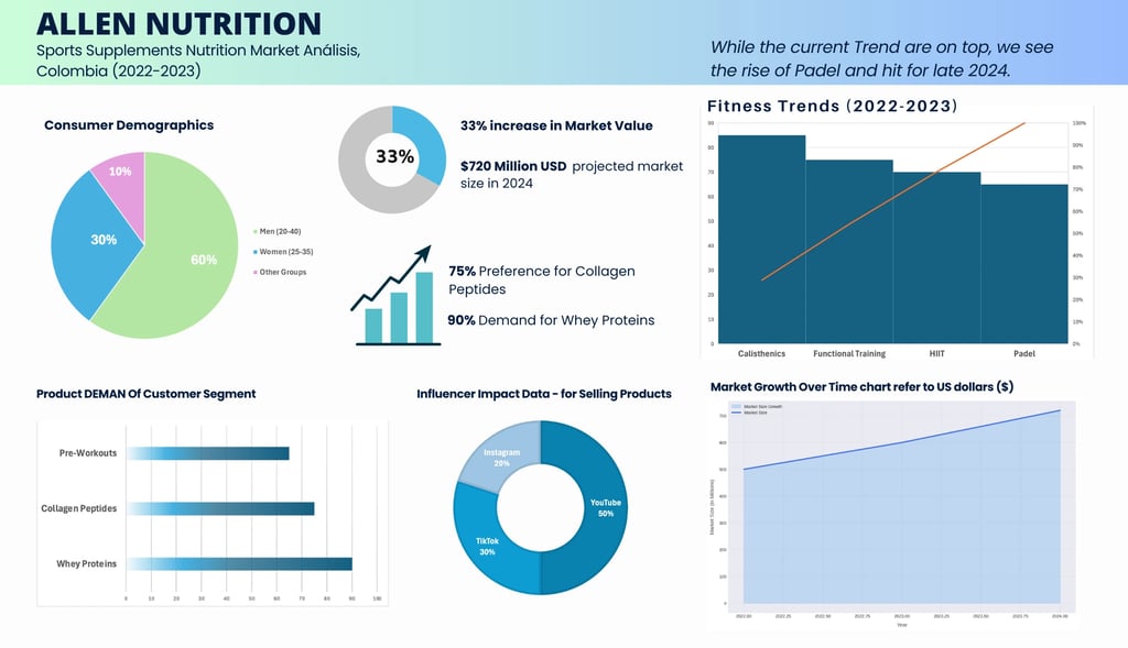 Allen Nutrition, a sports supplement brand under Allen Pharma (Colombia pharmaceutical company), required a comprehensive analysis of the Colombian market to understand consumer behaviors, fitness trends, and competitive dynamics. The goal was to identify growth opportunities in this rapidly expanding sector and align products with market needs.